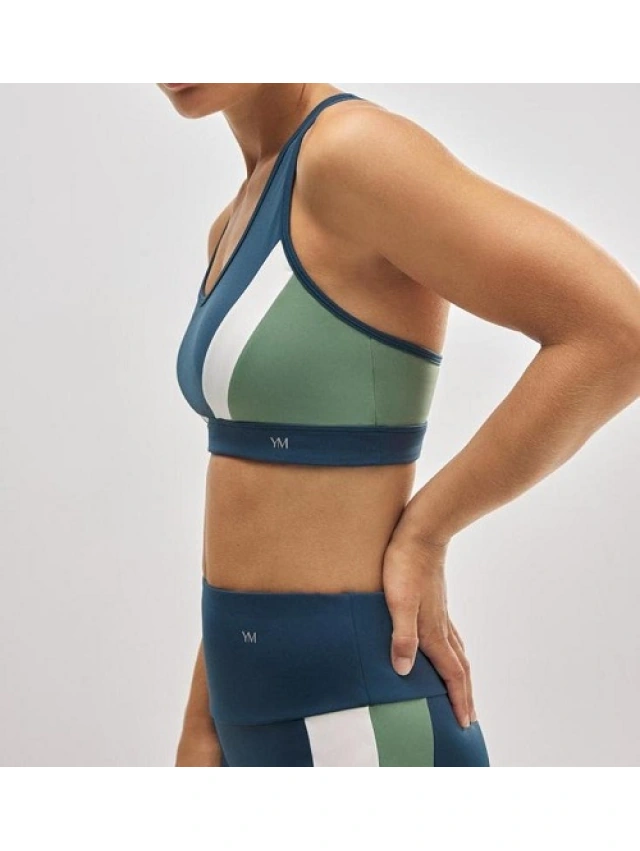 Sujetador deportivo que combina estilo y rendimiento con su diseño color block en tonos verde, azul y blanco.