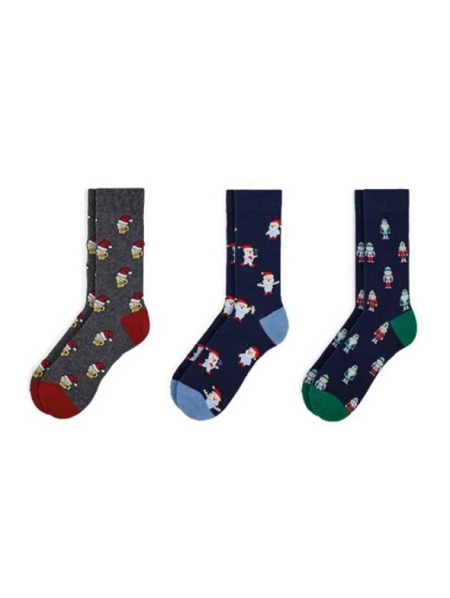 Descripción: - Pack de 3 pares de calcetines para hombre estampados navidad. - Presentados en una caja metálica, reutilizable y con música (cuando se abre). - Una original idea de regalo. - Calcetines de Navidad talla 40-45. - Composición: 72% algodón +26% polyester+2% elastano.