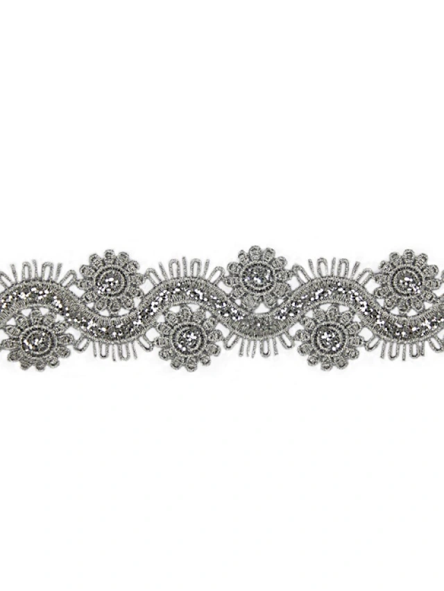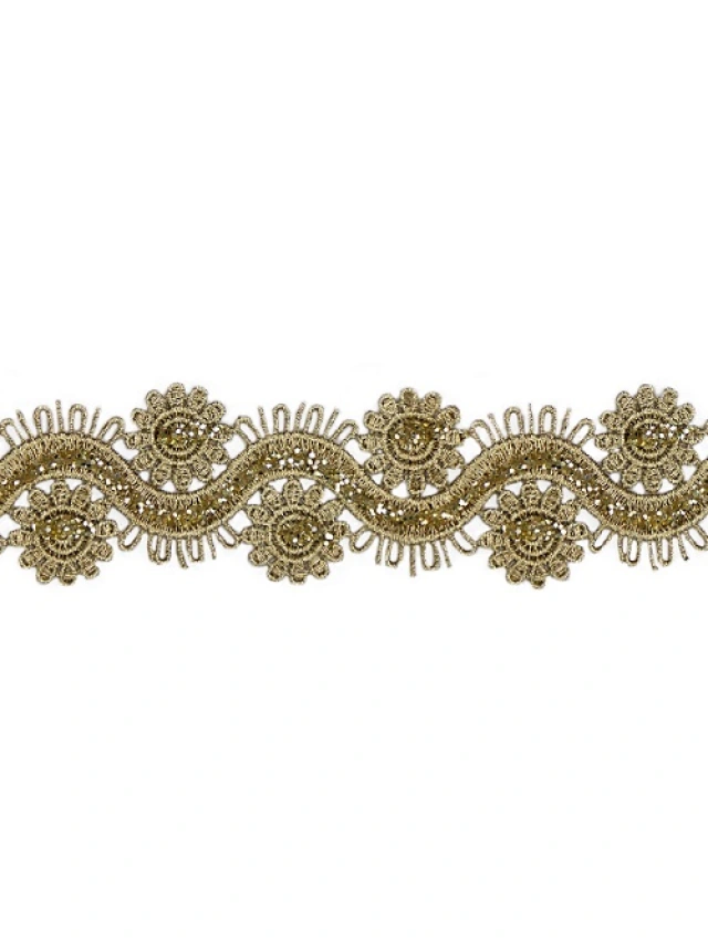 - Delicada pasamanería en tonos metalizados oro o plata. - Diseño con favorecedores brillos. - Venta por metro.
