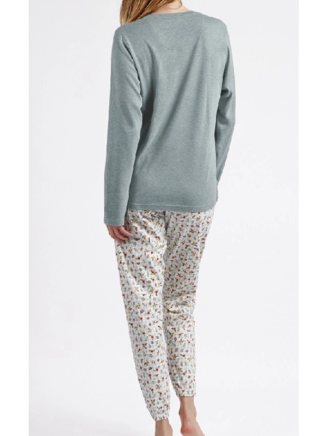 - Pijama de punto de algodón, de manga larga, cuello con tapeta con botones y pantalón largo.